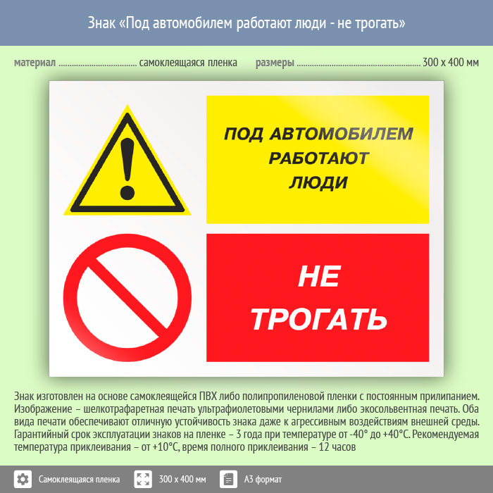 Знак «Под автомобилем работают люди – не трогать» может быть изготовлен любого размера на самоклеящейся пленке, пластике толщиной 0.5, 2 или 4 мм и металле. Также возможно применение фотолюминесцентных и световозвращающих материалов