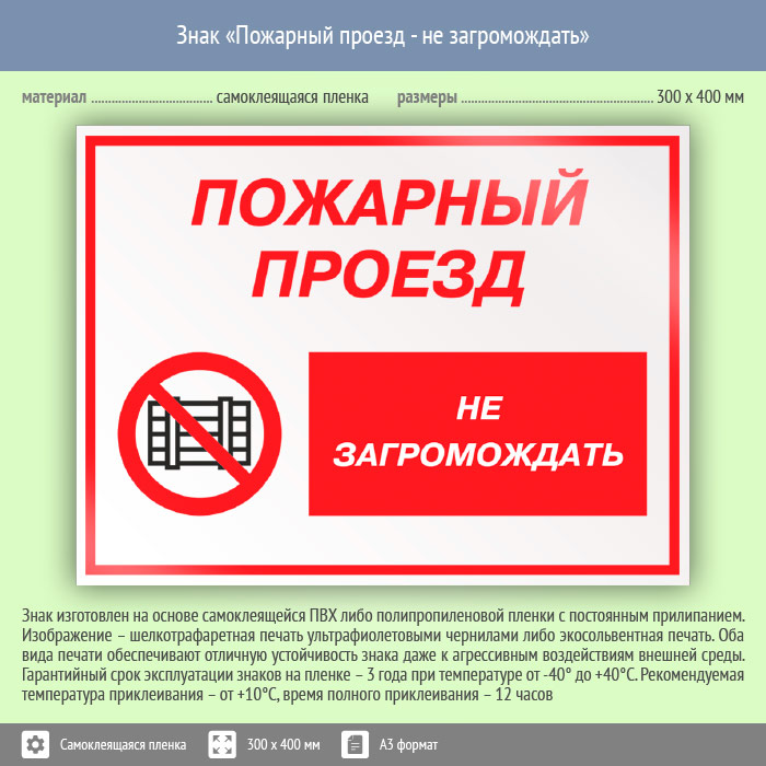 Знак «Пожарный проезд – не загромождать» может быть изготовлен любого размера на самоклеящейся пленке, пластике толщиной 0.5, 2 или 4 мм и металле. Также возможно применение фотолюминесцентных и световозвращающих материалов