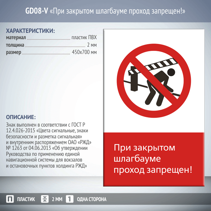 Знак безопасности «При закрытом шлагбауме проход запрещен!» выполняется в одностороннем (металл и пластик) и двустороннем (только металл) виде, на ПВХ-пластике, толщиной 2 мм или листе оцинкованного металла, толщиной 0,8 мм. Размеры знаков - 450 мм х 700 мм (вертикальная ориентация) либо 540 мм х 220 мм (горизонтальная ориентация). Знаки изготавливаются в полном соответствии с ГОСТ Р 12.4.026-2015 «Цвета сигнальные, знаки безопасности и разметка сигнальная» и внутренним распоряжением ОАО «РЖД» № 1263 от 04.06.2013 «Об утверждении Руководства по применению единой навигационной системы для вокзалов и остановочных пунктов холдинга РЖД». По желанию заказчика возможно использование светоотражающих материалов. Так же при необходимости производим закругление углов знака