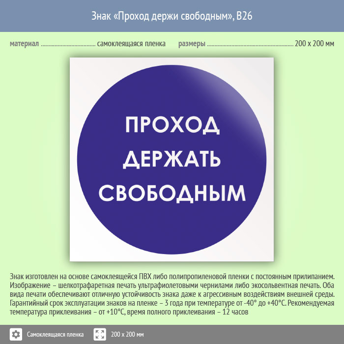 Знак «Проход держи свободным» имеет размер 200х200 мм