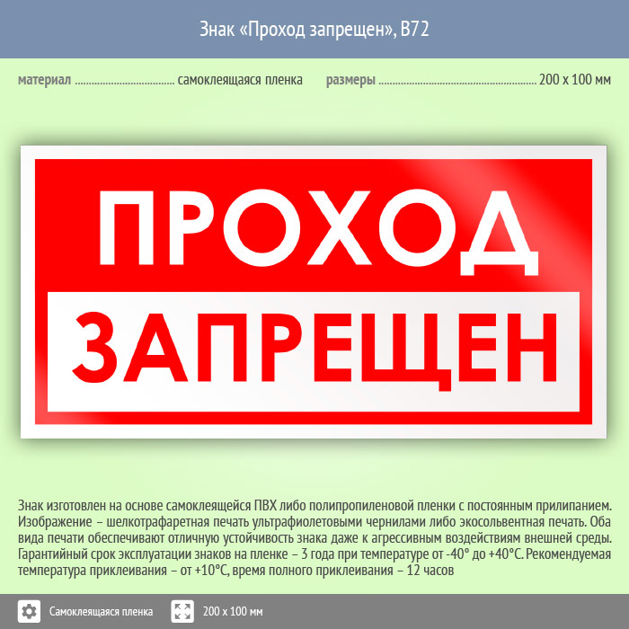 Знак «Проход запрещен» может быть изготовлен любого размера на самоклеящейся пленке, пластике толщиной 0.5, 2 или 4 мм и металле. Также возможно применение фотолюминесцентных и световозвращающих материалов