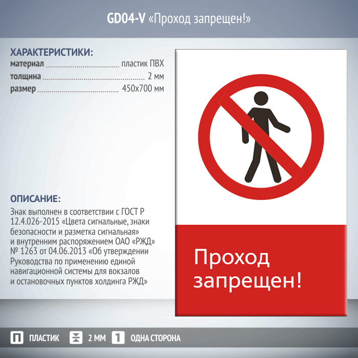 Знак безопасности «Проход запрещен!» (код GD04) выполняется в одностороннем (металл и пластик) и двустороннем (только металл) виде, на ПВХ-пластике, толщиной 2 мм или листе оцинкованного металла, толщиной 0,8 мм. Размеры знаков - 450 мм х 700 мм (вертикальная ориентация) либо 540 мм х 220 мм (горизонтальная ориентация). Знаки изготавливаются в полном соответствии с ГОСТ Р 12.4.026-2015 «Цвета сигнальные, знаки безопасности и разметка сигнальная» и внутренним распоряжением ОАО «РЖД» № 1263 от 04.06.2013 «Об утверждении Руководства по применению единой навигационной системы для вокзалов и остановочных пунктов холдинга РЖД». По желанию заказчика возможно использование светоотражающих материалов. Так же при необходимости производим закругление углов знака