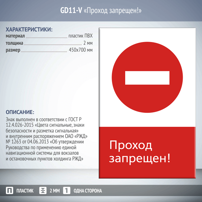 Знак безопасности «Проход запрещен!» (код GD11) выполняется в одностороннем (металл и пластик) и двустороннем (только металл) виде, на ПВХ-пластике, толщиной 2 мм или листе оцинкованного металла, толщиной 0,8 мм. Размеры знаков - 450 мм х 700 мм (вертикальная ориентация) либо 540 мм х 220 мм (горизонтальная ориентация). Знаки изготавливаются в полном соответствии с ГОСТ Р 12.4.026-2015 «Цвета сигнальные, знаки безопасности и разметка сигнальная» и внутренним распоряжением ОАО «РЖД» № 1263 от 04.06.2013 «Об утверждении Руководства по применению единой навигационной системы для вокзалов и остановочных пунктов холдинга РЖД». По желанию заказчика возможно использование светоотражающих материалов. Так же при необходимости производим закругление углов знака