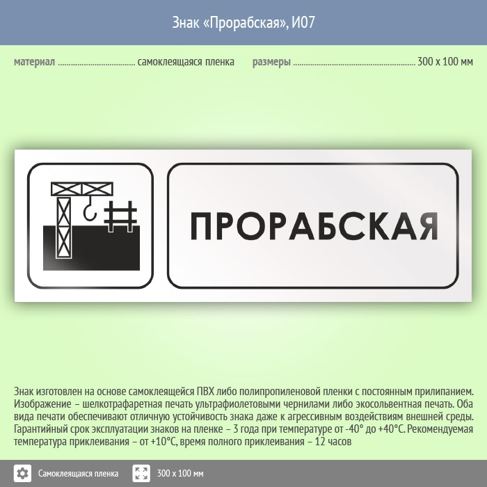 Знак «Прорабская» может быть изготовлен любого размера на самоклеящейся пленке, пластике толщиной 0.5, 2 или 4 мм и металле. Также возможно применение фотолюминесцентных и световозвращающих материалов