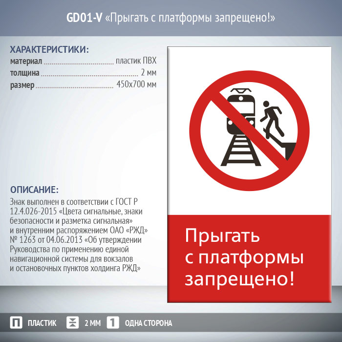 Знак безопасности «Прыгать с платформы запрещено!» выполняется в одностороннем (металл и пластик) и двустороннем (только металл) виде, на ПВХ-пластике, толщиной 2 мм или листе оцинкованного металла, толщиной 0,8 мм. Размеры знаков - 450 мм х 700 мм (вертикальная ориентация) либо 540 мм х 220 мм (горизонтальная ориентация). Знаки изготавливаются в полном соответствии с ГОСТ Р 12.4.026-2015 «Цвета сигнальные, знаки безопасности и разметка сигнальная» и внутренним распоряжением ОАО «РЖД» № 1263 от 04.06.2013 «Об утверждении Руководства по применению единой навигационной системы для вокзалов и остановочных пунктов холдинга РЖД». По желанию заказчика возможно использование светоотражающих материалов. Так же при необходимости производим закругление углов знака