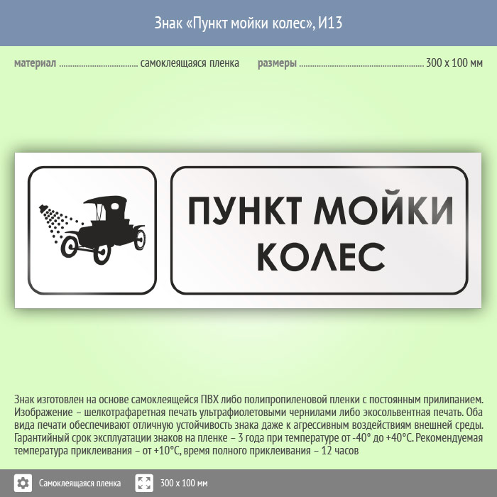 Знак «Пункт мойки колес» может быть изготовлен любого размера на самоклеящейся пленке, пластике толщиной 0.5, 2 или 4 мм и металле. Также возможно применение фотолюминесцентных и световозвращающих материалов