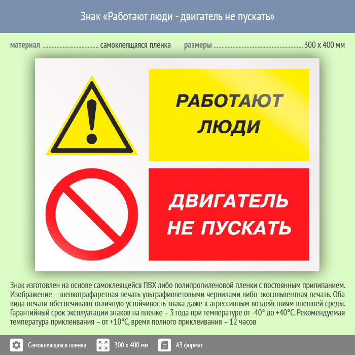 Знак «Работают люди – двигатель не пускать» может быть изготовлен любого размера на самоклеящейся пленке, пластике толщиной 0.5, 2 или 4 мм и металле. Также возможно применение фотолюминесцентных и световозвращающих материалов