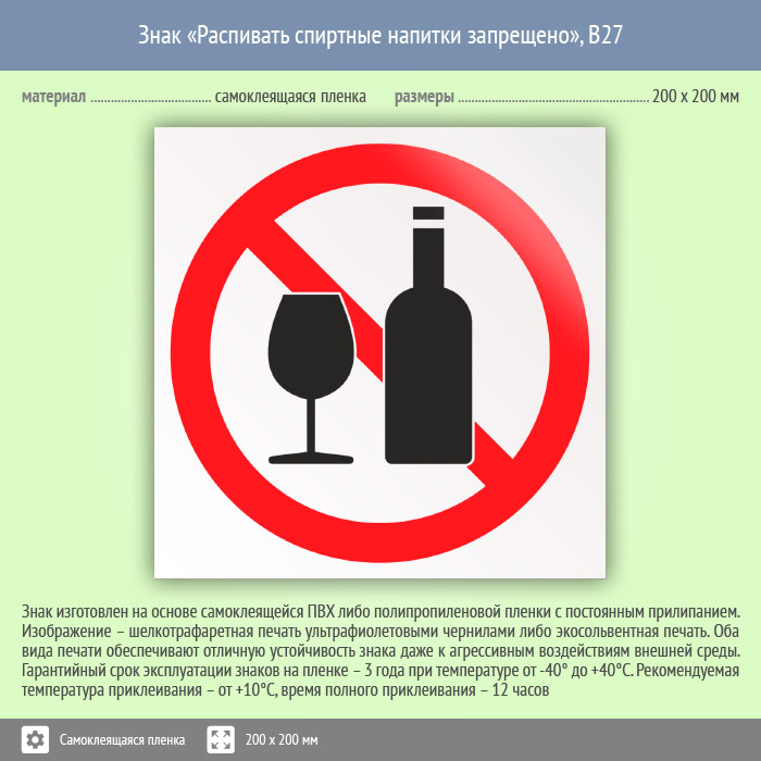 Знак «Распивать спиртные напитки запрещено» может быть изготовлен любого размера на самоклеящейся пленке, пластике толщиной 0.5, 2 или 4 мм и металле. Также возможно применение фотолюминесцентных и световозвращающих материалов