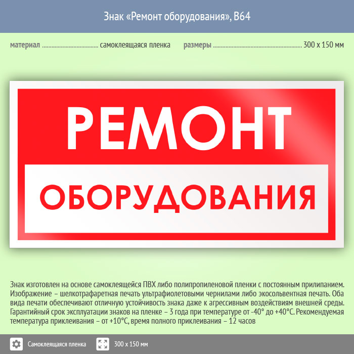 Знак «Ремонт оборудования» имеет размер 300х150 мм