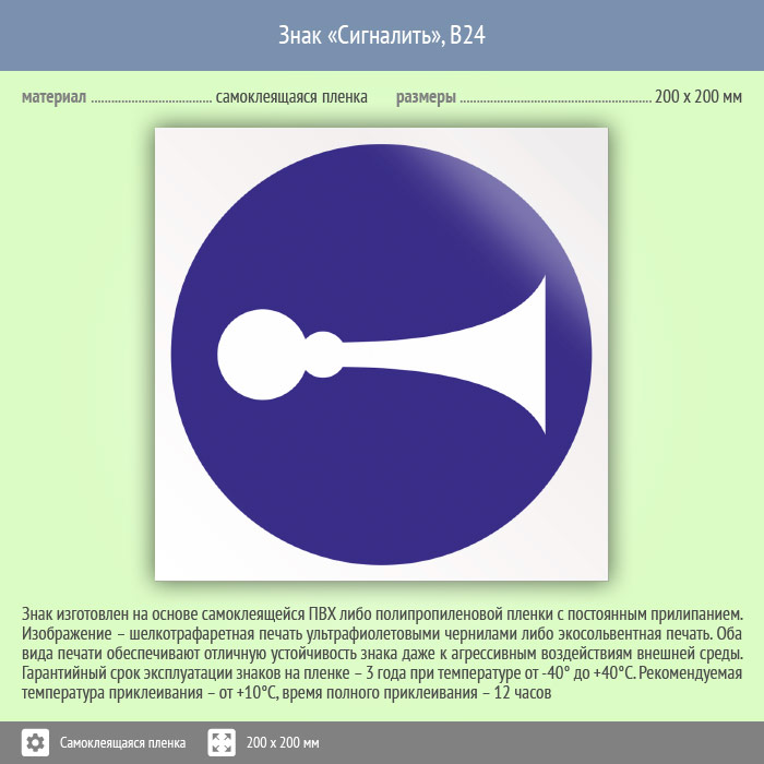 Знак «Сигналить» может быть изготовлен любого размера на самоклеящейся пленке, пластике толщиной 0.5, 2 или 4 мм и металле. Также возможно применение фотолюминесцентных и световозвращающих материалов