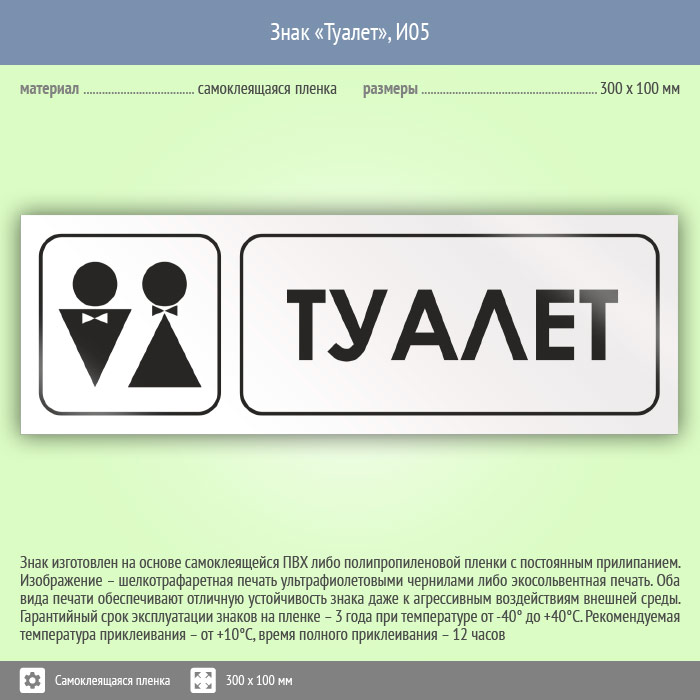 Знак «Туалет» может быть изготовлен любого размера на самоклеящейся пленке, пластике толщиной 0.5, 2 или 4 мм и металле. Также возможно применение фотолюминесцентных и световозвращающих материалов
