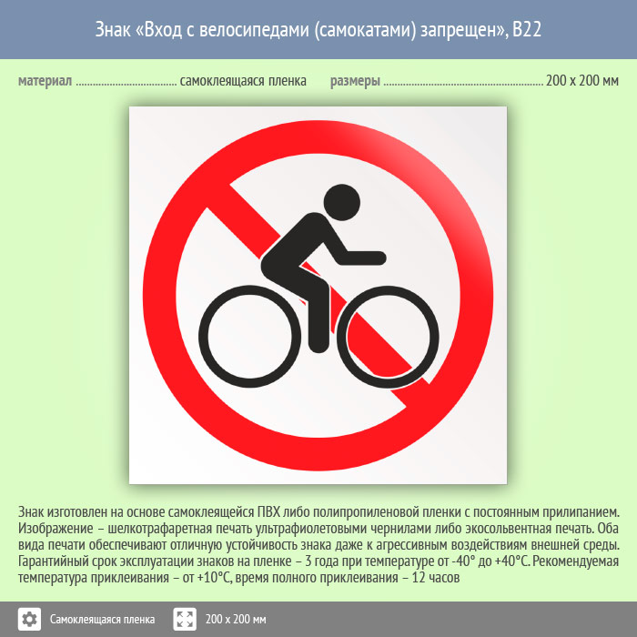 Знак «Вход с велосипедами (самокатами) запрещен» может быть изготовлен любого размера на самоклеящейся пленке, пластике толщиной 0.5, 2 или 4 мм и металле. Также возможно применение фотолюминесцентных и световозвращающих материалов
