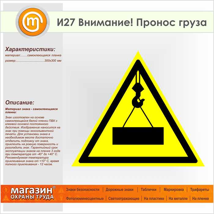 Табличка «Внимание! Пронос груза» предупреждает об опасности в близи работы подъемника или крана и возможном проносе груза. Код знака: И27