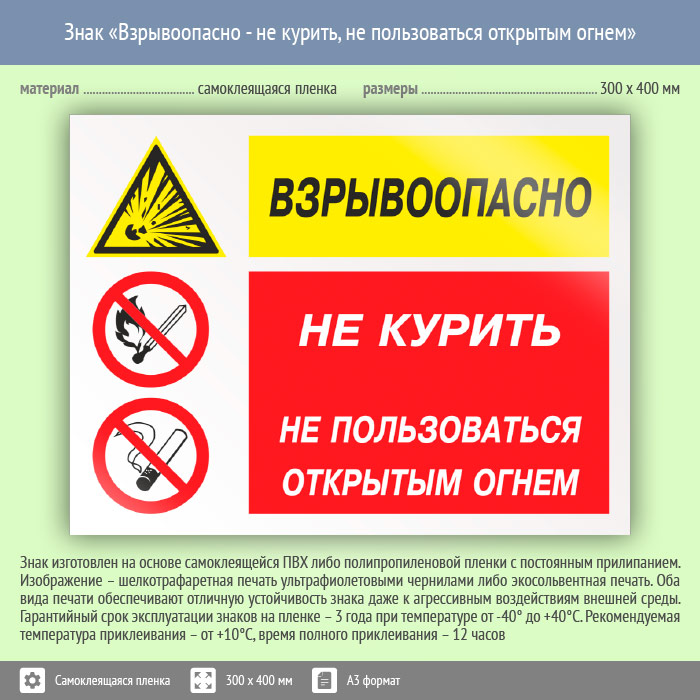 Знак «Взрывоопасно – не курить, не пользоваться открытым огнем» может быть изготовлен любого размера на самоклеящейся пленке, пластике толщиной 0.5, 2 или 4 мм и металле. Также возможно применение фотолюминесцентных и световозвращающих материалов