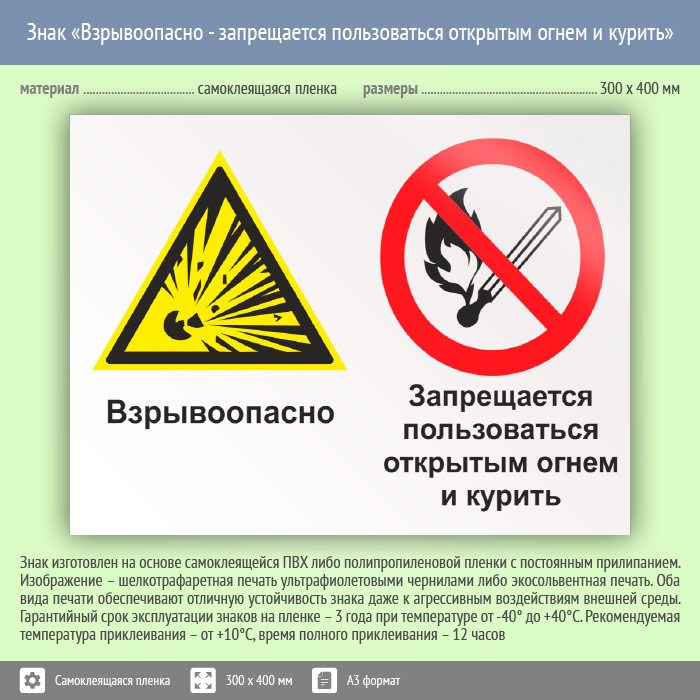 Знак «Взрывоопасно – запрещается пользоваться открытым огнем и курить» может быть изготовлен любого размера на самоклеящейся пленке, пластике толщиной 0.5, 2 или 4 мм и металле. Также возможно применение фотолюминесцентных и световозвращающих материалов