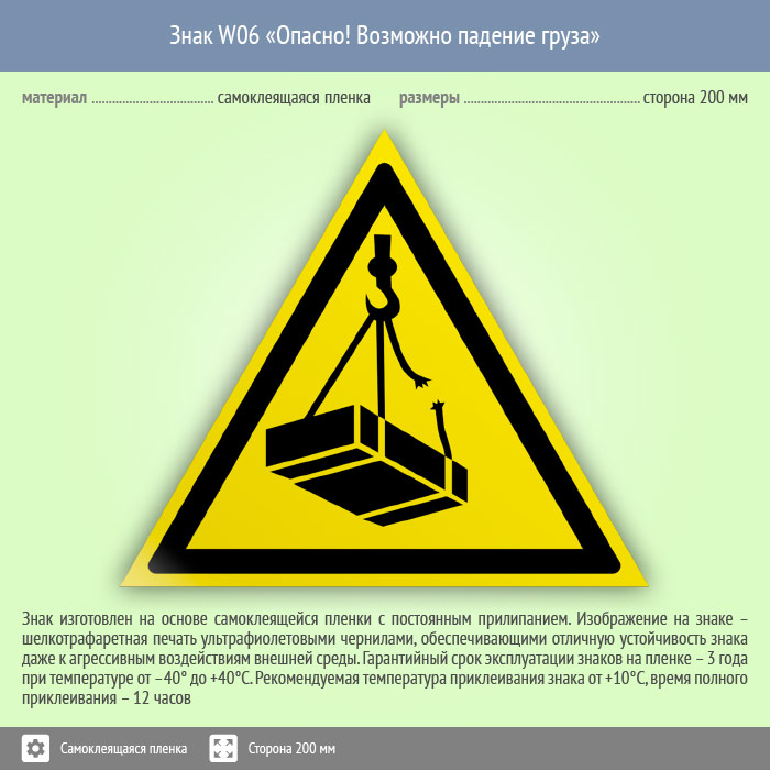 Знак «Опасно! Возможно падение груза» может быть изготовлен любого размера на самоклеящейся пленке, пластике толщиной 0.5, 2 или 4 мм и металле. Также возможно применение фотолюминесцентных и световозвращающих материалов