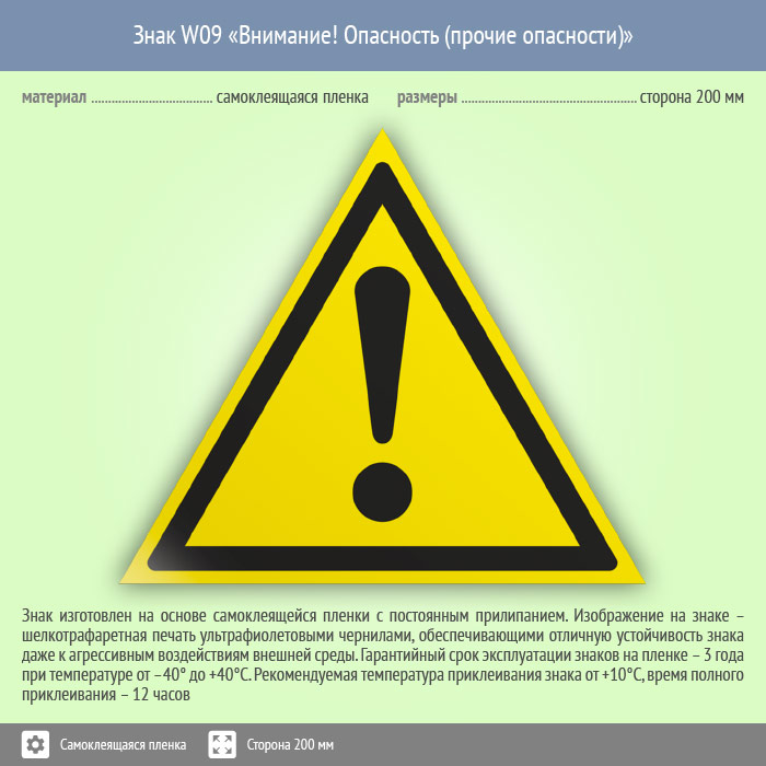 Знак «Внимание! Опасность (прочие опасности)» обозначает любую опасность с целью привлечения внимания, идет в комбинации поясняющей надписью. Код знака: W09