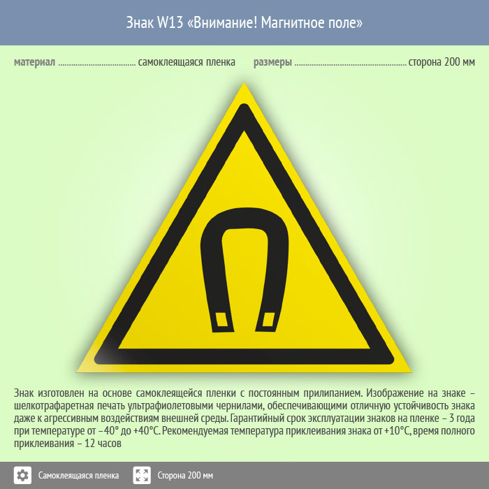 Знак «Внимание! Магнитное поле» вывешивается вблизи действия установок, вырабатывающих или использующих сильное магнитное поле. Код знака: W13