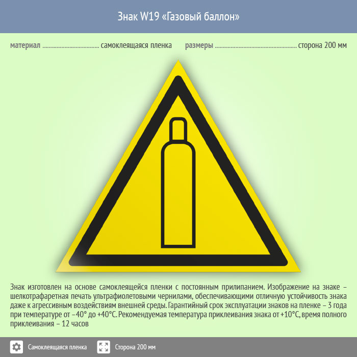 Знак «Газовый баллон» устанавливают в местах хранения баллонов с газом. Код знака: W19