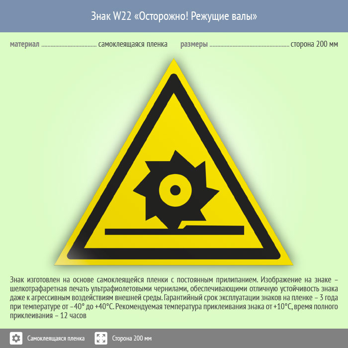 Знак «Осторожно! Режущие валы» может быть изготовлен любого размера на самоклеящейся пленке, пластике толщиной 0.5, 2 или 4 мм и металле. Также возможно применение фотолюминесцентных и световозвращающих материалов