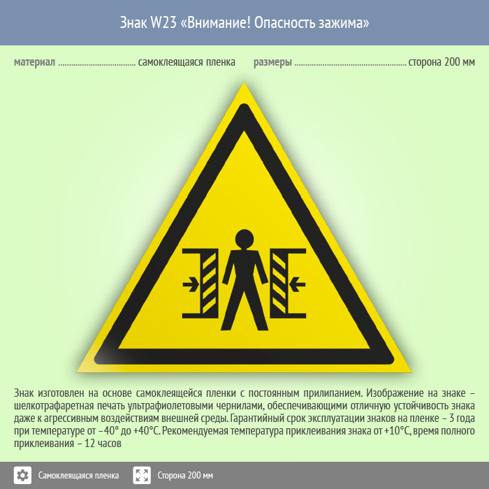Знак «Внимание! Опасность зажима» размещают в опасных местах для предупреждения травматизма. Код знака: W23