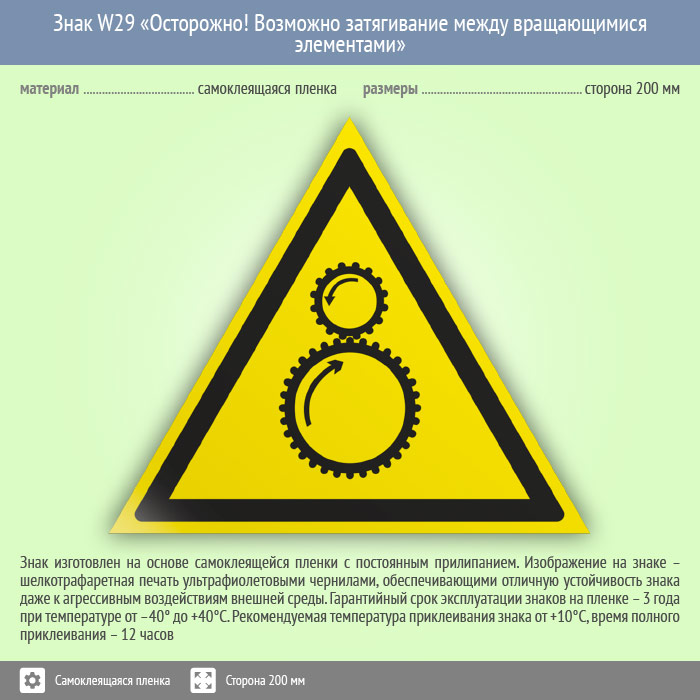 Знак «Осторожно! Возможно затягивание между вращающимися элементами» может быть изготовлен любого размера на самоклеящейся пленке, пластике толщиной 0.5, 2 или 4 мм и металле. Также возможно применение фотолюминесцентных и световозвращающих материалов