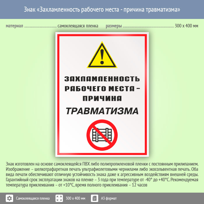 Знак «Захламленность рабочего места – причина травматизма» изготавливается в нескольких типоразмерах