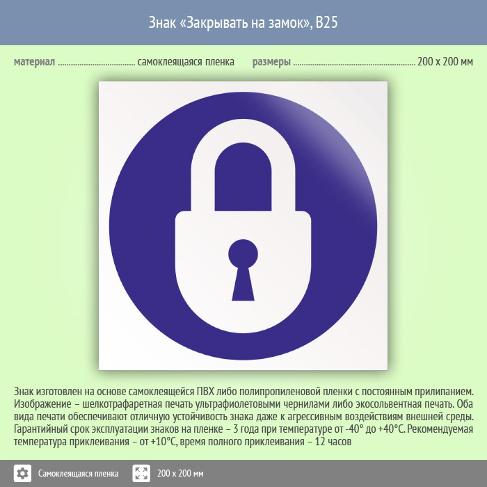 Знак «Закрывать на замок» может быть изготовлен любого размера на самоклеящейся пленке, пластике толщиной 0.5, 2 или 4 мм и металле. Также возможно применение фотолюминесцентных и световозвращающих материалов