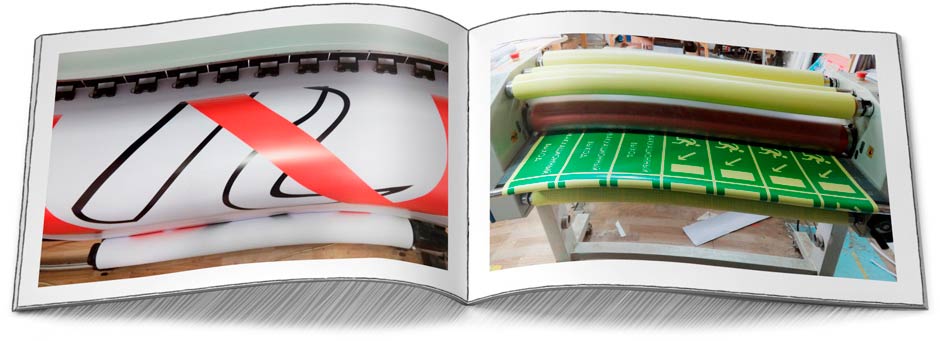 На сегодняшний день на нашем производстве это единственный способ изготовления малотиражных или многоцветных знаков на пластике. Коротко о процессе: знаки печатаются на широкоформатном печатающем плоттере на самоклеящейся пленке с использованием экосольвентных чернил, затем пленка с изображением накатывается на пластик ПВХ. Таким методом изготавливаются часть вспомогательных знаков на пластике, знаки на пластике для строительных площадок, ЛЭП, газопроводов -