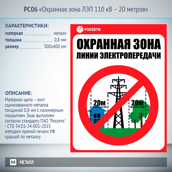 Знак безопасности «Охранная зона ЛЭП 110 кВ – 20 метров» выполнен согласно стандарта ПАО «Россети» – СТО 34.01-24-001-2015 методом прямой печати УФ краской по металлу. Материал знака – лист оцинкованного металла толщиной 0,8 мм с полимерным покрытием. Размеры знака – 300×400 мм