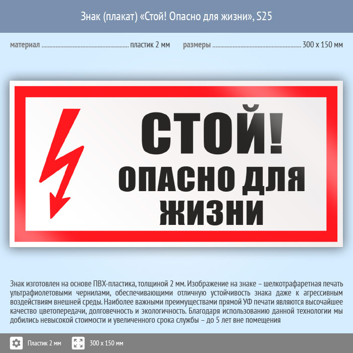 Знак (плакат) «Стой! Опасно для жизни», S25 на пластике, размером 300х150 мм предупреждает об опасностях с угрозой для жизни. Знаки и плакаты по электробезопасности изготовлены согласно требованиям Министерства энергетики России и являются предупреждающими знаками об опасности, связанной с электронапряжением