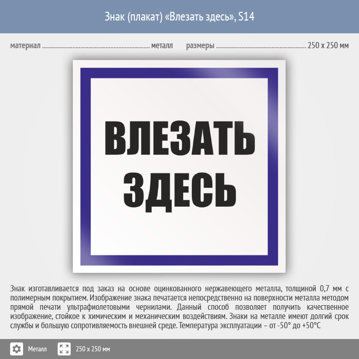 Знак (плакат) «Влезать здесь», S14 на металле, размером 250х250 мм обозначает безопасный путь подъема к рабочему месту, находящемуся на высоте. Знаки и плакаты по электробезопасности изготовлены согласно требованиям Министерства энергетики России и являются предупреждающими знаками об опасности, связанной с электронапряжением