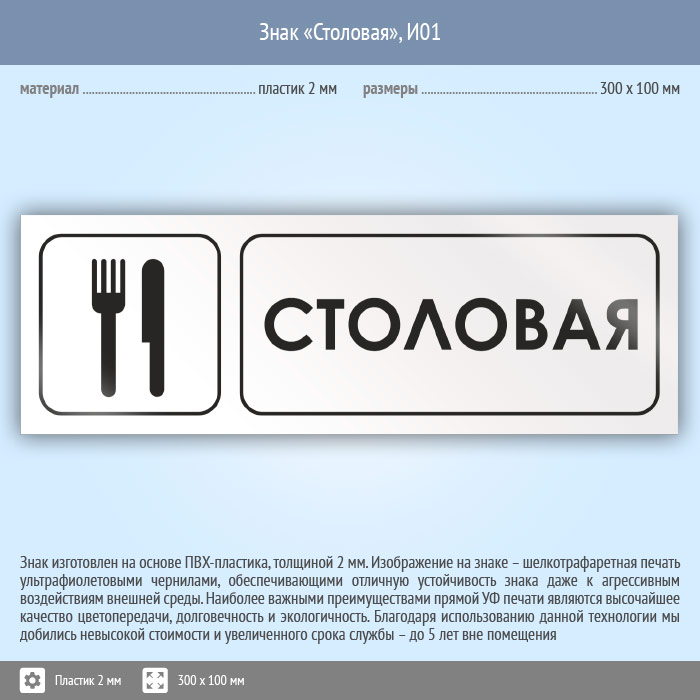Знак «Столовая», И01 (пластик, 300х100 мм)