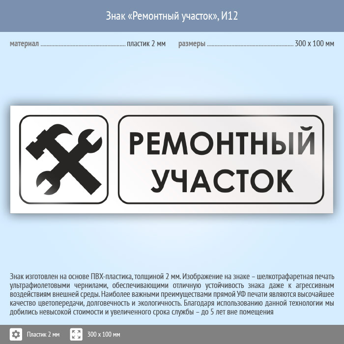 Знак «Ремонтный участок», И12 (пластик, 300х100 мм)