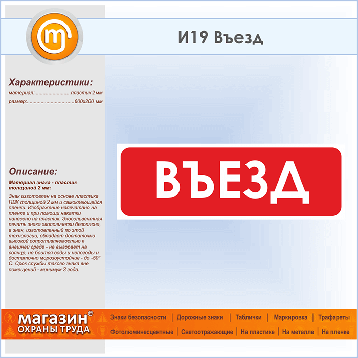 Знак «Въезд», И19 (пластик, 600х200 мм)