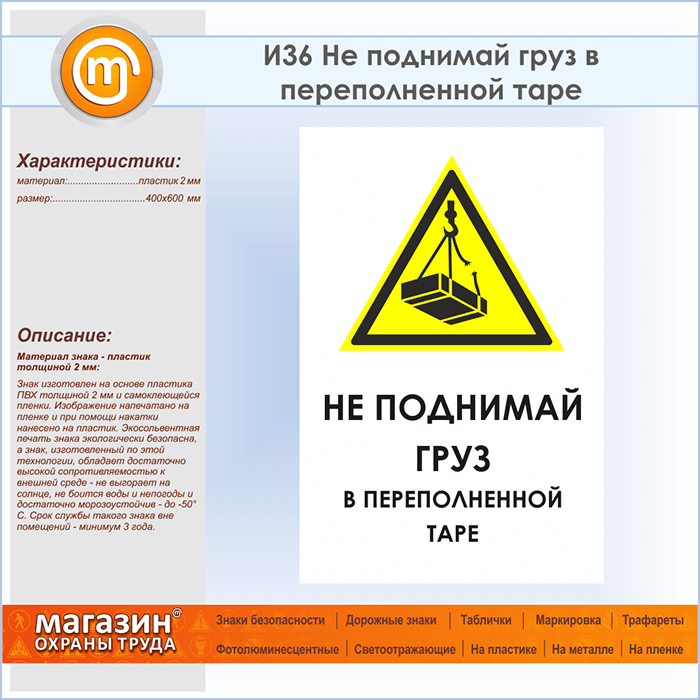 Знак «Не поднимай груз в переполненной таре», И36 на пластике, размером 400х600 мм напоминает о недопустимости перегрузки подъемной тары. Указательные таблички и предупреждающие знаки на строительной площадке помогут ориентироваться на месте строительства