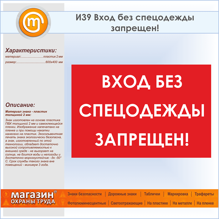 Знак «Вход без спецодежды запрещен!», И39 (пластик, 600х400 мм)