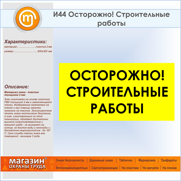 Знак «Осторожно! Строительные работы», И44 (пластик, 600х300 мм)