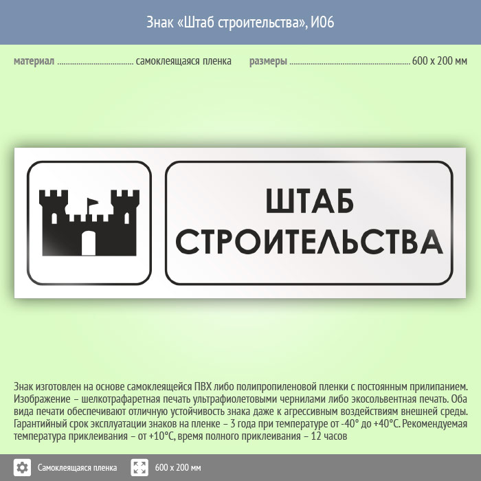 Знак «Штаб строительства», И06 (пленка, 600х200 мм)