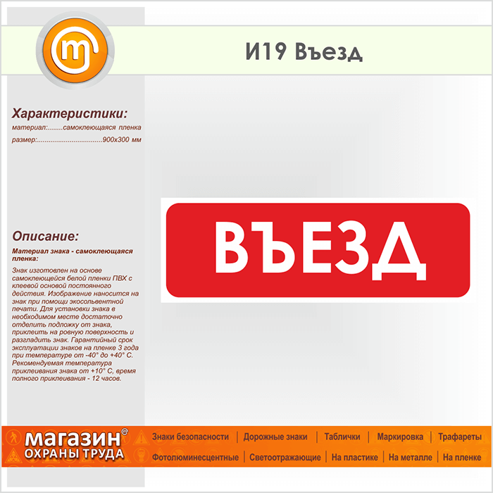 Знак «Въезд», И19 (пленка, 900х300 мм)