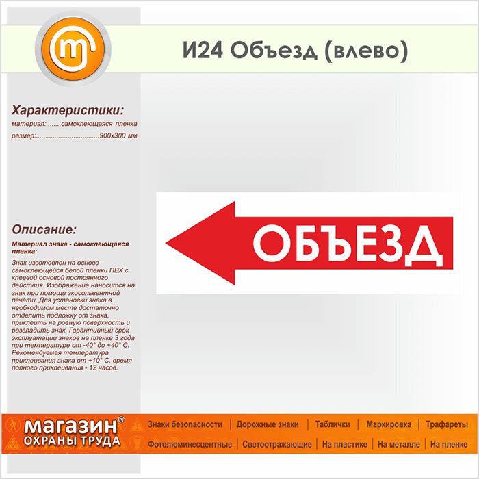 Знак «Объезд (влево)», И24 на пленке, размером 900х300 мм обозначает, что в данном месте объезд осуществляется с левой стороны. Указательные таблички и предупреждающие знаки на строительной площадке помогут ориентироваться на месте строительства