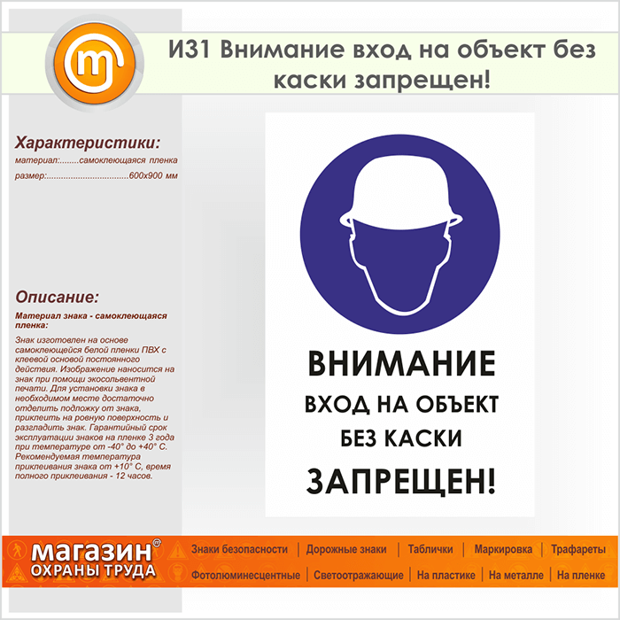Знак «Внимание вход на объект без каски запрещен!», И31 на пленке, размером 600х900 мм напоминает о необходимости использования средств защиты головы. Указательные таблички и предупреждающие знаки на строительной площадке помогут ориентироваться на месте строительства