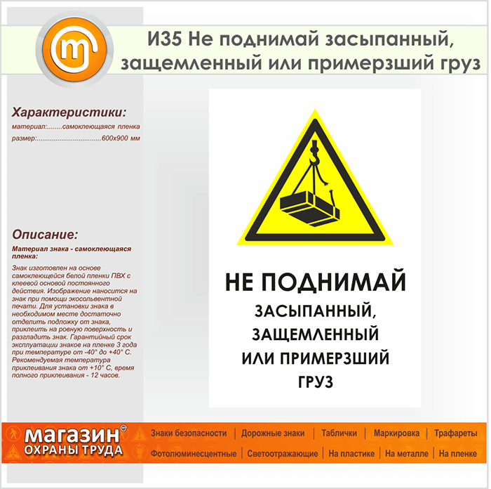 Знак «Не поднимай засыпанный, защемленный или примерзший груз», И35 на пленке, размером 600х900 мм напоминает об опасности поднятия зажатого или примерзшего груза. Указательные таблички и предупреждающие знаки на строительной площадке помогут ориентироваться на месте строительства
