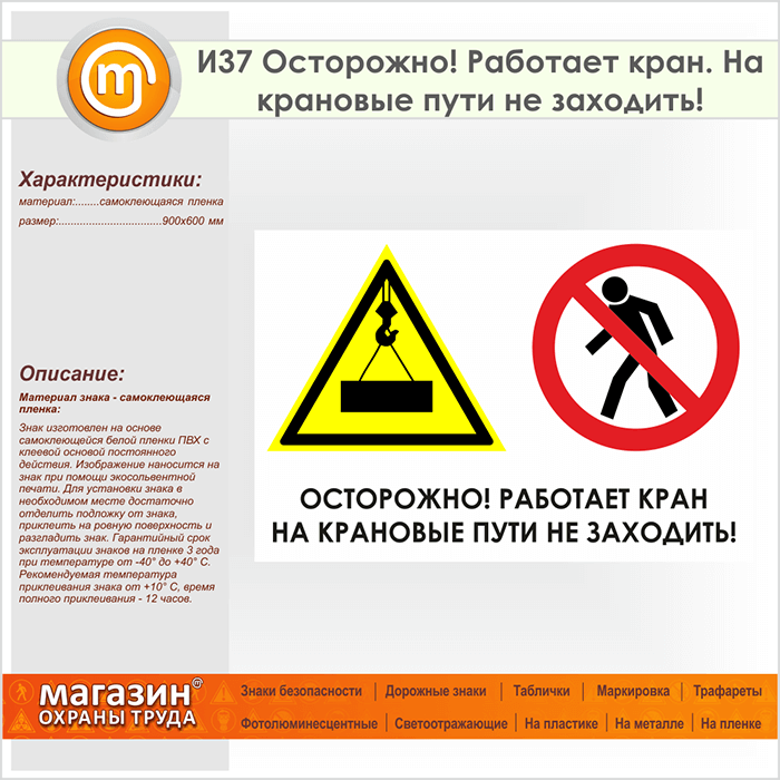Знак «Осторожно! Работает кран. На крановые пути не заходить!», И37 на пленке, размером 900х600 мм предупреждает о работе крана и об опасности выхода или перехода крановых путей. Указательные таблички и предупреждающие знаки на строительной площадке помогут ориентироваться на месте строительства