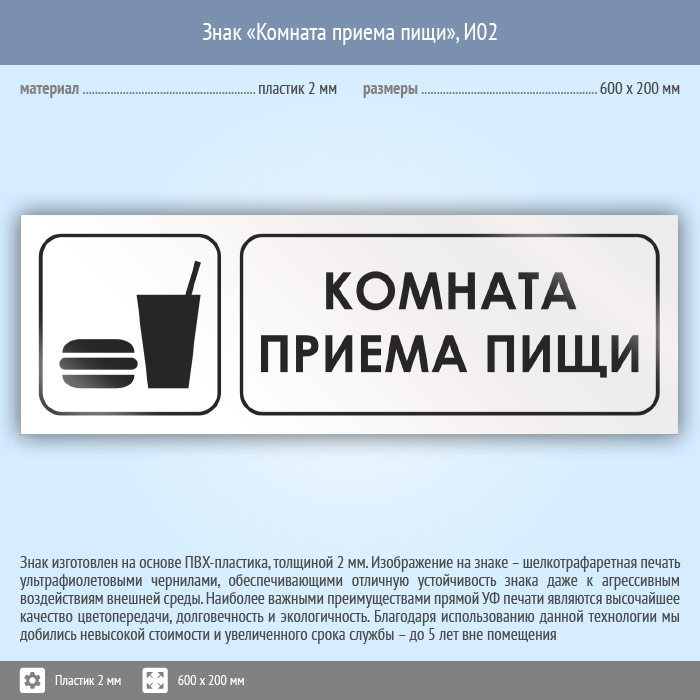 Знак «Комната приема пищи», И02 (пластик, 600х200 мм)