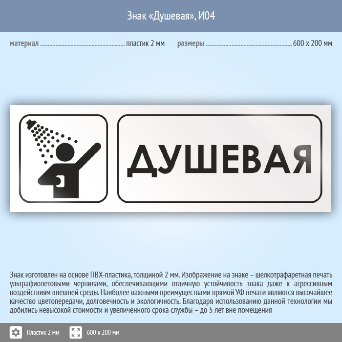 Знак «Душевая», И04 (пластик, 600х200 мм)