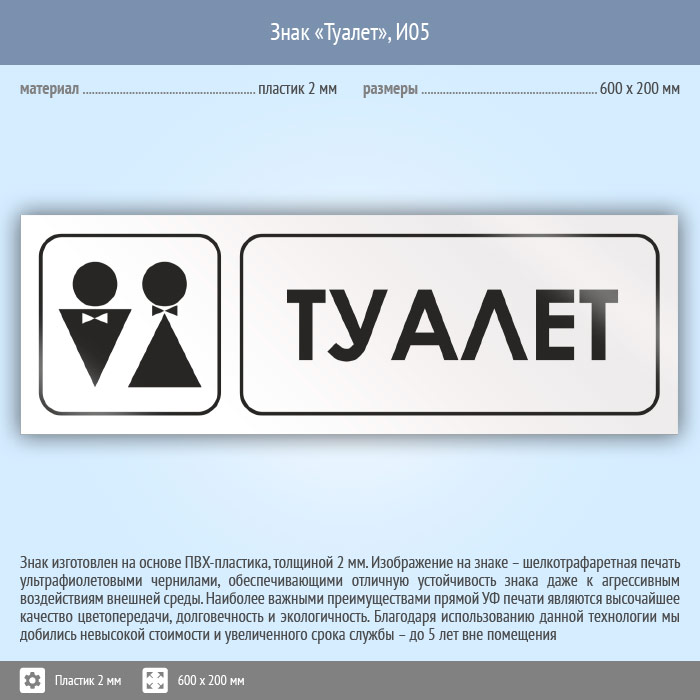 Знак «Туалет», И05 (пластик, 600х200 мм)