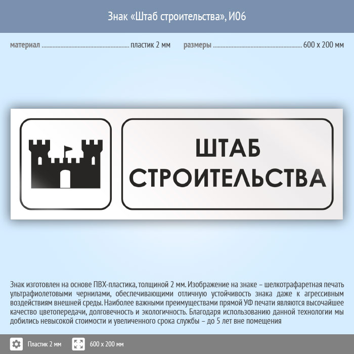 Знак «Штаб строительства», И06 (пластик, 600х200 мм)