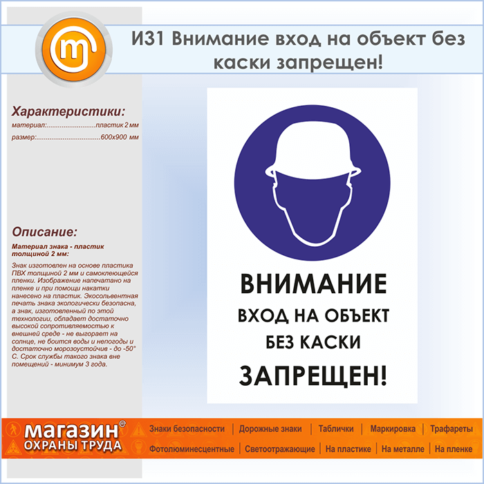 Знак «Внимание вход на объект без каски запрещен!», И31 на пластике, размером 600х900 мм напоминает о необходимости использования средств защиты головы. Указательные таблички и предупреждающие знаки на строительной площадке помогут ориентироваться на месте строительства
