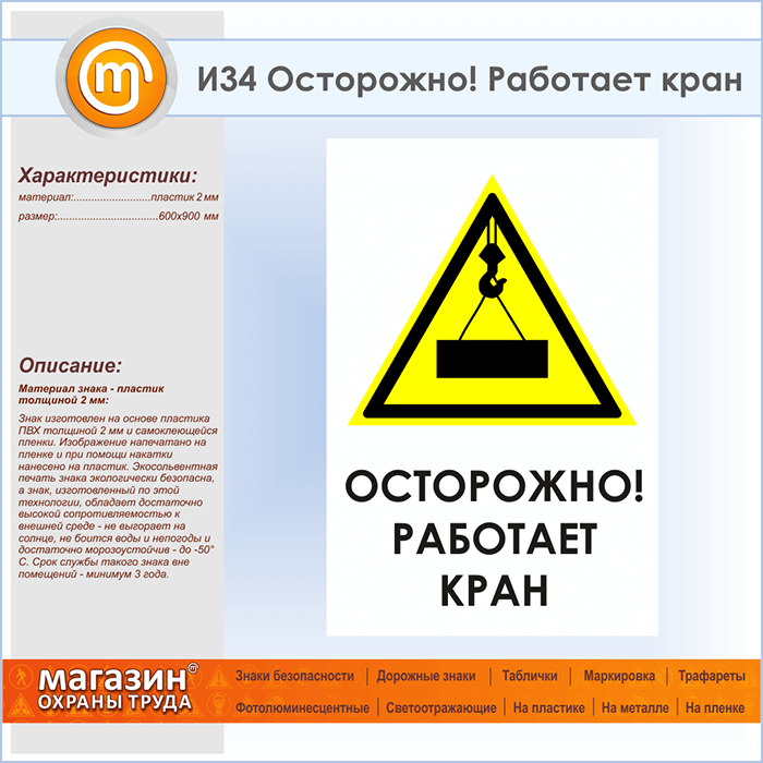 Знак «Осторожно! Работает кран», И34 на пластике, размером 600х900 мм предупреждает о работе крана и возможных опасностях, связанных с работой крана. Указательные таблички и предупреждающие знаки на строительной площадке помогут ориентироваться на месте строительства